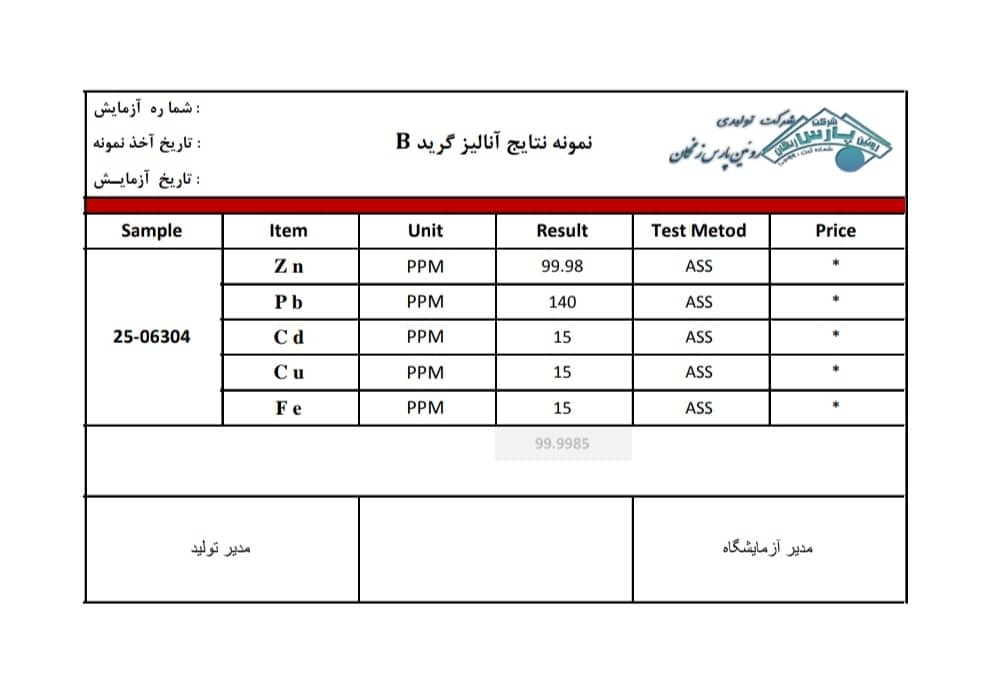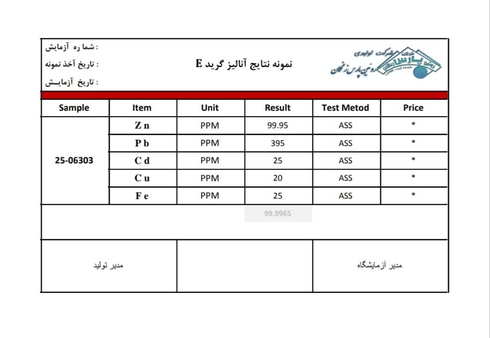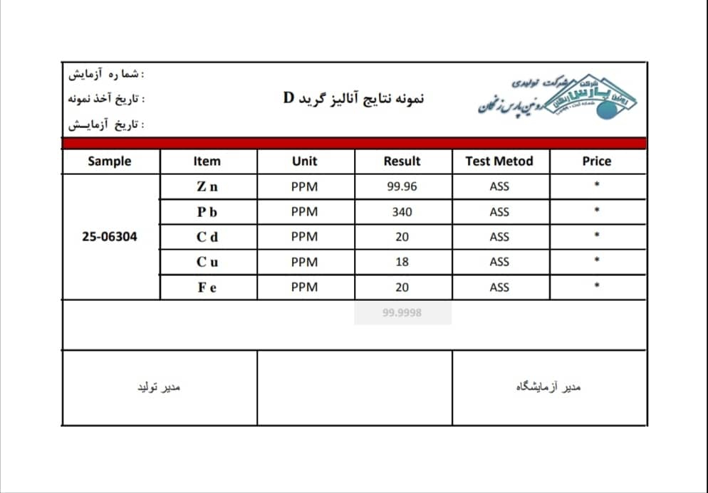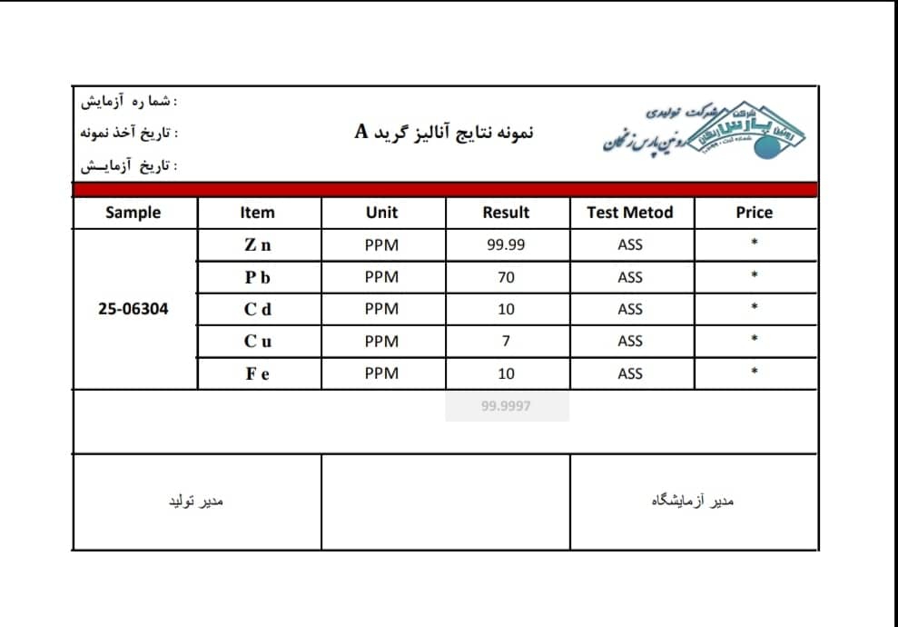 نمونه آنالیزهای شمش روی: